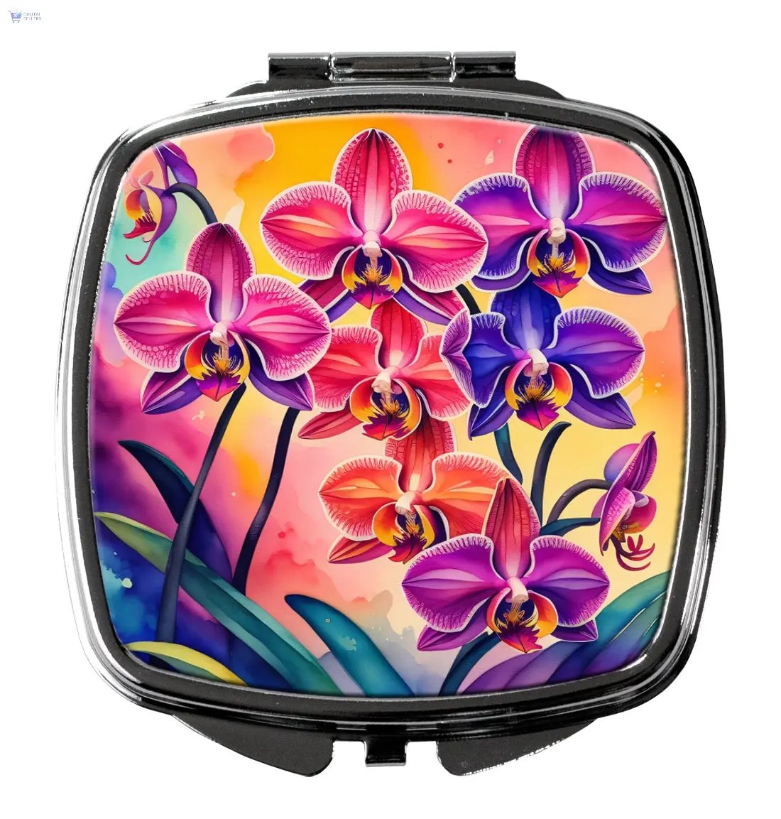 Compact Mirror featuring breed specific Orchids artwork. Introducing our Square Compact Mirror, a blend of elegance, functionality, and compactness, perfect for on-the-go touch-ups. This Silvertone metal mirror, with dimensions of 2.75 inches x 3 inches x .3 inches, fits effortlessly into your purse, handbag, or pocket, ensuring that you can check your appearance anytime, anywhere. Our compact mirror stands out with its eye-catching artwork on the front, adding a dash of style to this practical accessory. It is more than just a mirror; it's a statement piece that reflects your personality and aesthetic. When opened, this compact reveals two mirrors inside, doubling your perspective for precise touch-ups. The Silvertone metal construction ensures durability while maintaining a lightweight feel, making it an ideal everyday carry item. Whether you're rushing to a meeting, prepping for a dinner date, or just need a quick check on your look, our Square Compact Mirror is your reliable companion. Experience the perfect blend of style and practicality with this must-have accessory.